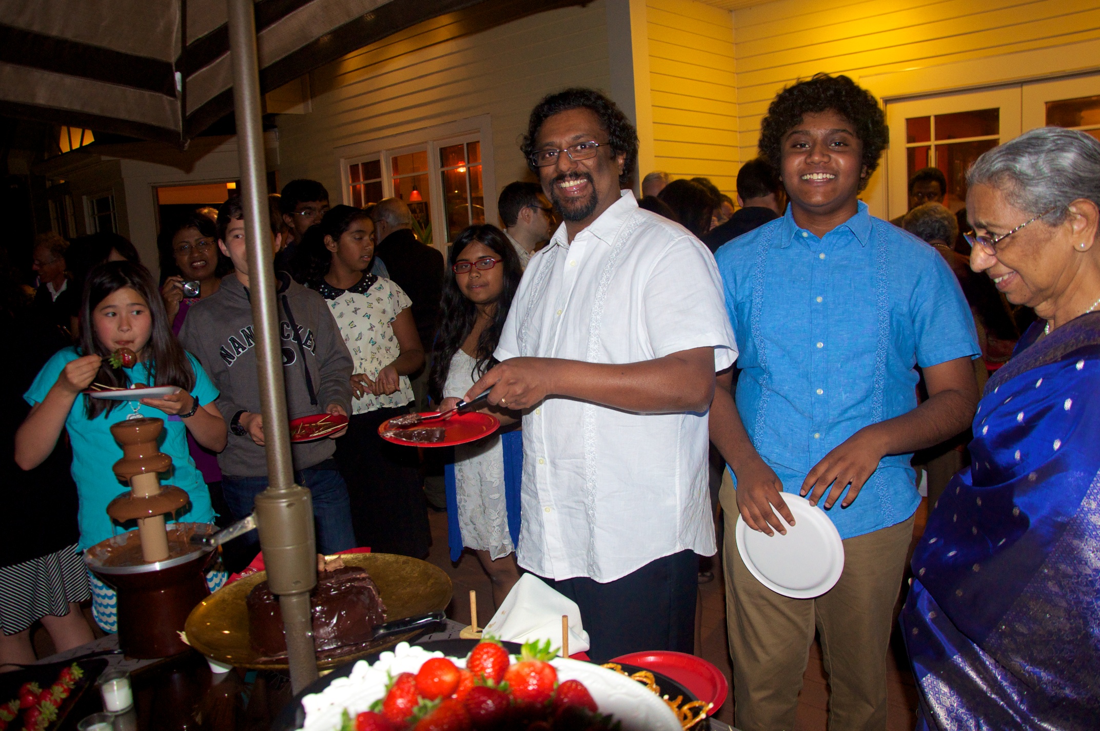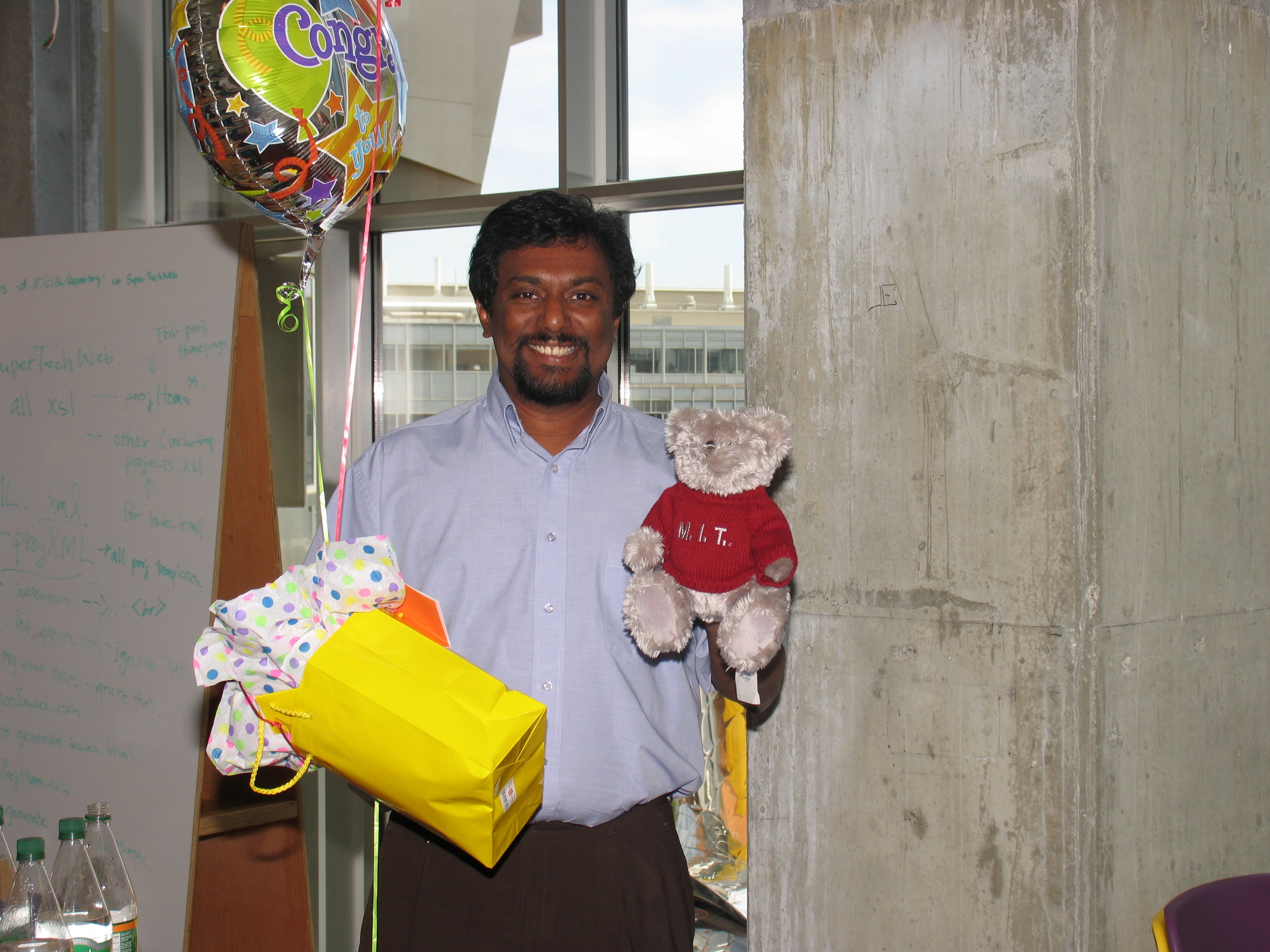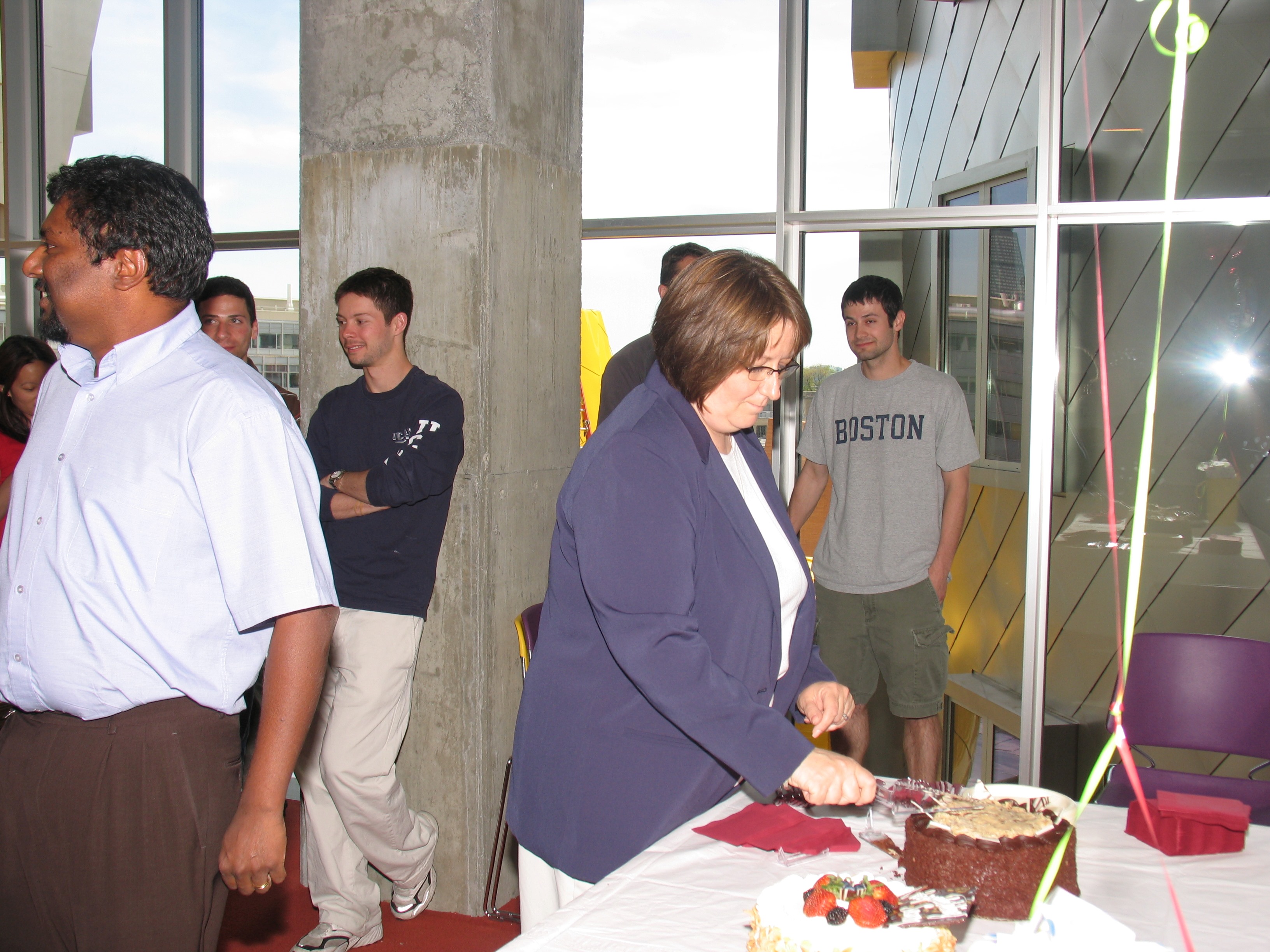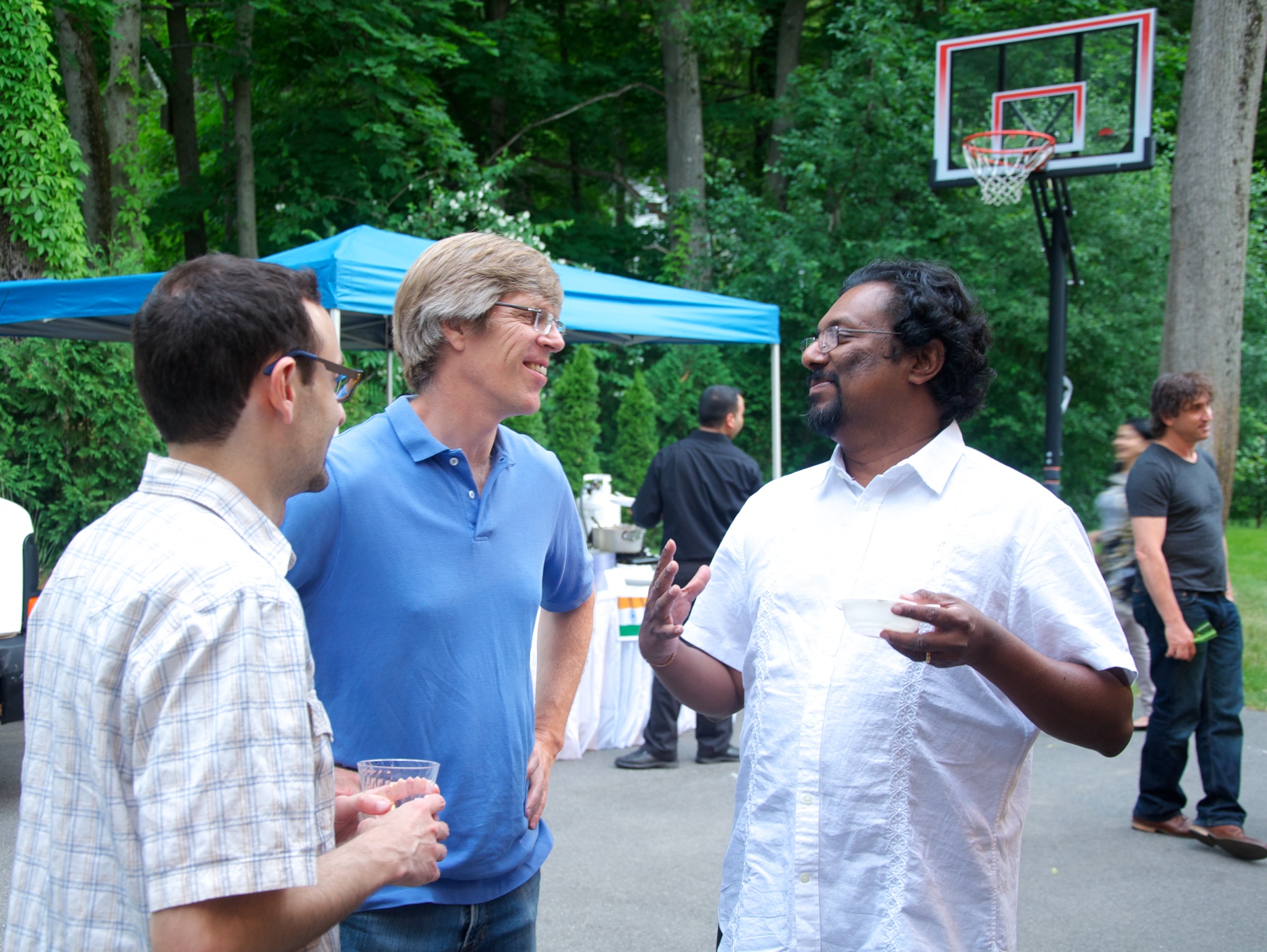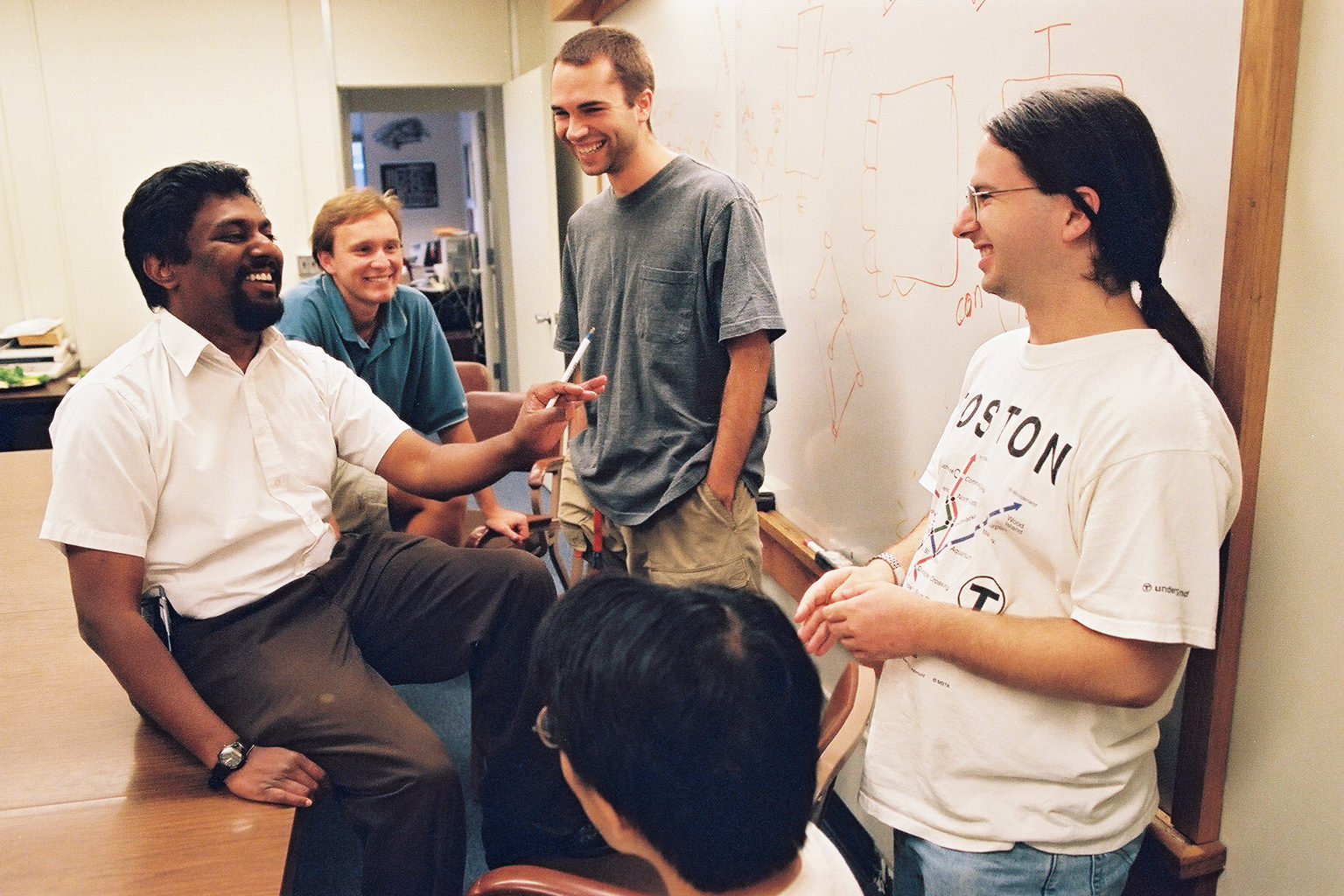 A gathering to celebrate the newly tenured professors took place at the Gray House last week. Far left is mechanical engineering associate professor Gang Chen, Saman Amarasinghe,associate professor of electrical engineering and computer science, President Charles M. Vest, Dave Perreault, assistant professor of electrical engineering and computer science, and Arindam Dutta, assistant professor of architecture.